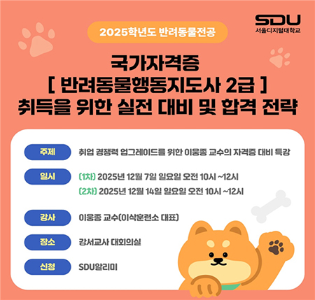 사이버대학 서울디지털대 반려동물학과, 국가자격증 반려동물행동지도사 2급 대비 특강 개최…전문가 이웅종 교수, 자격취득 전략 공유부터 합격 노하우까지