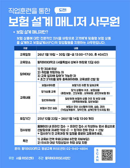 동덕여자대학교 RISE센터, ‘보험 설계 매니저 사무원’ 교육생 무료 모집